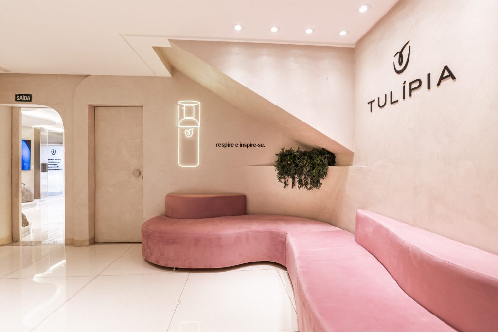 O projeto arquitetônico destaca o diferencial sensorial dos produtos da Tulípia, com foco em cheiro e textura, algo que só pode ser percebido através do contato físico.